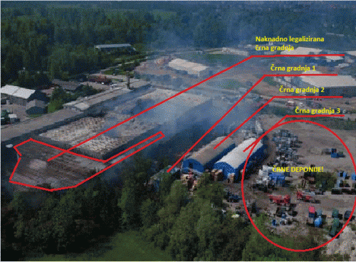 Z rdečo obkrožena na črno zgrajena nadstrešnica je po trditvi UE Vrhnika bila zgrajena že leta 2010. Za gradbeno dovoljenje je investitor Kemis d.o.o. zaprosil 1. marca 2017, dobil ga je v rekordno hitrem času, kar je v Sloveniji prav neverjetno, in sicer že 21. aprila 2017. Postavlja se vprašanje, kako je lahko dobil Kemis d.o.o. 2011 uporabno dovoljenje, 2013 še okoljevarstveno dovoljenje za dejavnost, ki jo je izvajal tudi v na črno zgrajenem delu objekta, v katerem se opravlja za ljudi in preostalo naravo ravnanje z nevarnimi odpadki, ki jo nedvomno opredeljuje okoljevarstveno dovoljenje?