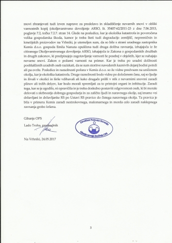 v katerem so navedeni pogoji in navodila, v skladu s katerimi lahko posluje. Glede na ostre zahteve, pod katerimi bi Kemis moral poslovati, bi, če bi to res počel, kakor je bilo v okoljevarstvenem dovoljenju zapisano, ne moglo priti do katastrofe. Čakamo na zapisnike inšpekcijskih pregledov, za katere smo zaprosili 22. maja 2017 in nam jih še niso poslali ali pa nas poklicali, da si njihove vsebine pogledamo.