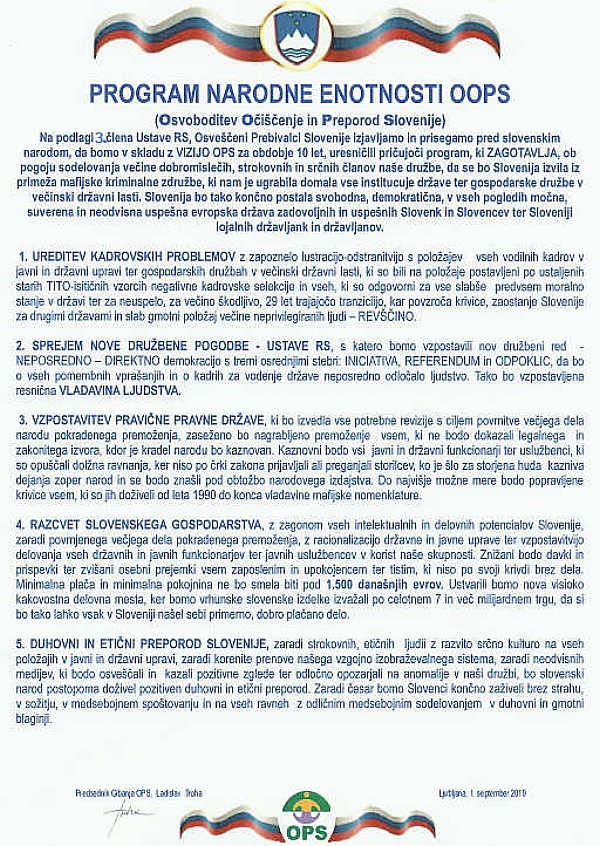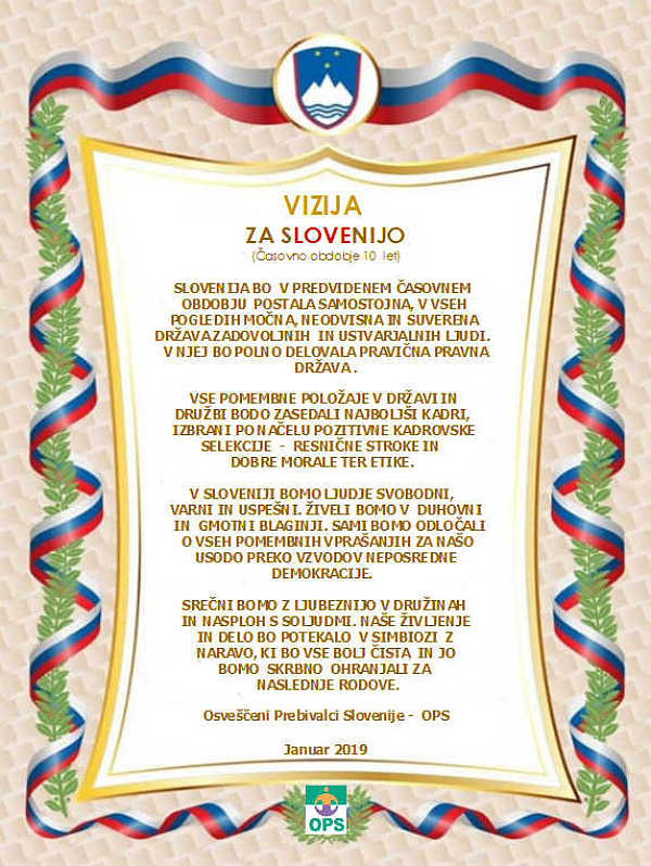 Ima v Sloveniji oblast ljudstvo?Smo na vseh volitvah po letu "91 dobili poštene voditelje?Jih želite gledati še naprej?V kolikor je odgovor NE, prosimo, berite naprej, sicer to ni poziv za vas.JAVNI POZIV NARODULista OPS – Osveščeni prebivalci SlovenijeEdina nadstrankarska ljudska lista za Osvoboditev, Očiščenje in Preporod SlovenijeSLOVENIJA JE NA ZGODOVINSKI PRELOMNICIDiagnoza akutnega stanjaKer sedanji politični, pravni in gospodarski sistem deluje vse manj v dobrobit ljudi, temveč v korist ozkih interesnih skupin in neformalnih centrov moči. Metanje peska v oči z nekaj sto evri božičnice in povečanjem minimalne plače na raven, ki je še vedno nižja kot v Beogradu, so drobtine, ki nam jih mečejo z vrha, kjer obvladujejo med 70–80 % vsega kapitala, medtem ko si ga med sabo deli 20 % prvorazrednih privilegiranih državljanov.Ostali neprivilegirani, drugorazredni — ki nas je 80 % — pa se prerivamo med sabo za 20 % ustvarjenih ali sposojenih evrov iz skupne blagajne.Soočamo se z razraščeno korupcijo, vse več raznovrstnega kriminala in vse močnejšo vladavino organizirane hudodelske združbe – globoke države, neučinkovitim in selektivnim pravosodjem, sesuvanjem zdravstva, kadrovskimi primanjkljaji v policiji, šolstvu, zdravstvu in drugod v sistemu države, kjer je treba delati, razprodajajo in dogajajo se prevzemi naših gospodarskih družb in bank, selitve podjetij v tujino zaradi davčnih optimizacij, naraščajočo draginjo, socialno negotovostjo ter množičnim izseljevanjem mladih.Zaupanje ljudi v politiko, institucije in medije je na najnižji ravni od osamosvojitve, suverenost države pa se vse bolj razkraja. Odvisni smo od tujega denarja, hrane, nebo nam "varujejo" tuja letala, energentov in tuje delovne sile v vse večjem odstotku.Slovenija ima katastrofalno demografsko sliko — prebivalstvo se hitro stara, rodnost je najnižja v zgodovini države, mlade družine zaradi negotovosti, dragih stanovanj in nepredvidljive prihodnosti odlašajo z ustvarjanjem ali povečevanjem družin ter se odseljujejo.Namesto da bi država vlagala v slovenske družine in prihodnost naroda, odločevalci množično, nekontrolirano in prekomerno uvažajo tujo delovno silo ter spodbujajo socialni turizem, kar dodatno obremenjuje socialni sistem in ogroža socialno, kulturno in narodno ravnovesje.Postajamo vse večji dolžniški sužnji globalističnim kreditodajalcem. Poroštvo za zagotavljanje vračila kreditov je naloženo vsem nam na ramena. Vsak državljan ima že preko 20.000 € državnega kredita na hrbtu. Ko bo konec zmožnosti odplačevanja iz proračuna, bodo kreditodajalci poslali rubežnike. Po drugi strani pa je zaradi gospodarskega oškodovanja vsak državljan oškodovan za okoli 190.000€.Digitalizacija nas bo spravila na elektronski povodec in v popolno suženjstvo, da o načrtni depopulaciji niti ne govorimo. Tehnokratski totalitarizem prihaja skozi velika vrata. Agenda NWO 2030 je blizu. Prihajajo pritiski, ki bodo za mnoge neznosni, če se enotno takim načrom zasužnjevanja ne postavimo po robu.Najhuje pa je, da nam sistematično spodkopavajo moralni in duhovni temelj — relativizirajo resnico in odgovornost, rušijo vrednote ter razvrednotijo družino, človeško dostojanstvo, narodno zavest in prihodnost slovenskega naroda.Danes ni več dovolj lepšati fasade, barvati oken in vrat v tej naši skupni hiši — ker se sesuva sam temelj slovenstva.Če ne ukrepamo zdaj in odločno, tvegamo gospodarski, demografski, moralni in duhovni zaton ter dokončno izgubo resnične suverenosti Slovenije. Slovenski narod, zaradi katerega ta država je, je na poti propada.Zato je skrajni čas za korenit prelom s strankokracijo, globoko državo in ugrabljenim sistemom. Čas je za Osvoboditev, Očiščenje in Preporod Slovenije.VSE POLITIČNE STRANKE MOLČIJO IN SE PRERIVAJO ZA SEDENJE V UDOBNIH FOTELJIHKer nobena politična stranka v Sloveniji — kljub večkratnim povabilom, posvetu v Žalcu 17. januarja 2026 in javnemu pozivu 19. januarja 2026 — ni bila pripravljena prevzeti odgovornosti in se zavezati ljudstvu za izvedbo Osvobodilnega programa narodne enotnosti (OOPS), to zgodovinsko odgovornost prevzemamo mi.(Ob tem moramo poudariti, da se je posveta udeležila stranka Straža v nastajanju, ki je načeloma sprejela program OOPS, vendar smo sodelovanje morali prekiniti zaradi njihovih ponavljajočih se skrajnih in polarizirajočih javnih stališč ter objav.Poleg tega Častne zaveze niso podpisali.)Zato se prvič v zgodovini oblikuje edina nadstrankarska neodvisna ljudska listaLISTA OPS – OSVEŠČENI PREBIVALCI SLOVENIJELista, ki ne pripada globoki državi, niti strankam pa tudi ne tujim interesnim skupinam ali korporacijam.To je lista, ki pripada ljudem. Vam!To je lista, ki jamči, da bo združen in enoten slovenski narod izvedel korenite, pozitivne in trajnostne politične ter družbene spremembe.Osvobodilni program narodne enotnosti (OOPS) - Osvoboditev, Očiščenje in Preporod bo izveden v PETIH KORAKIH:Terapija in faze za ozdravitev1. Sprejem nove Temeljne družbene pogodbe (po starem Ustave) za vzpostavitev neposredne karantanske vladavine ljudstva, temelječe na štirih osrednjih stebrih: javni izbori, iniciativa, referendum in dpoklic ter z ostalimi humanimi in poštenimi pravili, ki jo bomo sprejeli na Plebiscitu 2.0, devet mesecev po volitvah.2. Izkoreninjenje negativne kadrovske selekcije, ukinitev strankokracije in razgradnja globoke države - onemogočanje vpliva neformalnih centrov moči na odločitve javnih in državnih organov, ukinitev oblastniških privilegijev.3. Vzpostavitev pravične pravne države,revizija divjih lastninjenj, krivičnih sodb in odprava krivic. Izkoreninje korupcije, nepotizma in klientelizma.4. Gospodarski razcvet in poštene razvojne priložnosti za vse. Zagon vseh intelektualnih in delovnih potencialov naših ljudi doma in vseh, ki se bodo vrnili iz tujine v Slovenijo saj bodo k temu spodbujani in posebej stimuliran