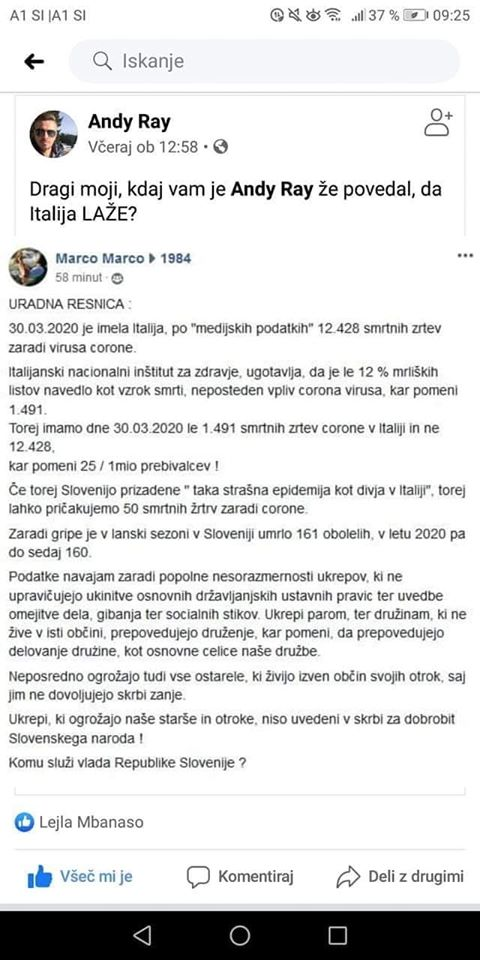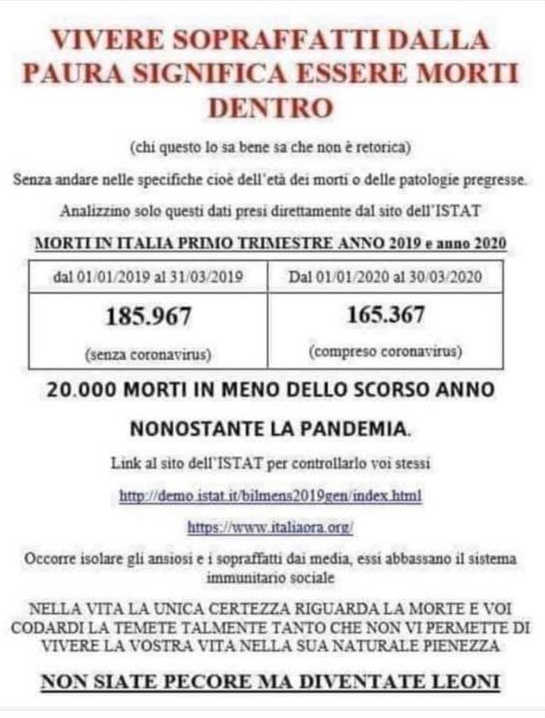 Ta podatek pa pove, da je lani, ko ni bilo nobene epidemije v Italiji v istem obdobju prvih treh mesecev, umrlo 20.000 več ljudi kot jih je letos ob tej "grozni" epidemiji.(Dodatek OPS)