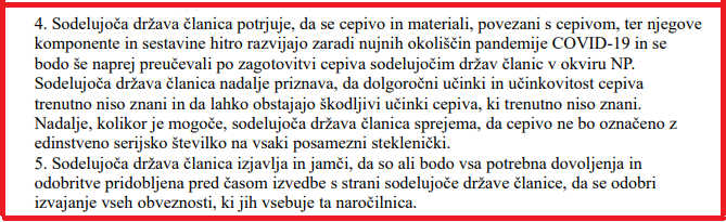 Tole je citat iz dokumenta, ki smo ga pridobili na zahtevo od Ministrstva za zdravje v skladu z Zakonom o dostopu do informacij javnega značaja in sicer v angleškem jeziku. Zahtevali smo vse pogodbe o nabavi vseh cepiv od leta 2018 dalje, pa so nam poslali najbrž po pomoti tudi to NAROČILNICO, ker če bi nam poslali anonimizirano - cenzurirano pogodbo med proizvajalci in evropsko komisijo, bi tega podatki ne našli, ker je v krovni pogodbi, ki je splošno znana, ta del prikrit s črno barvo.