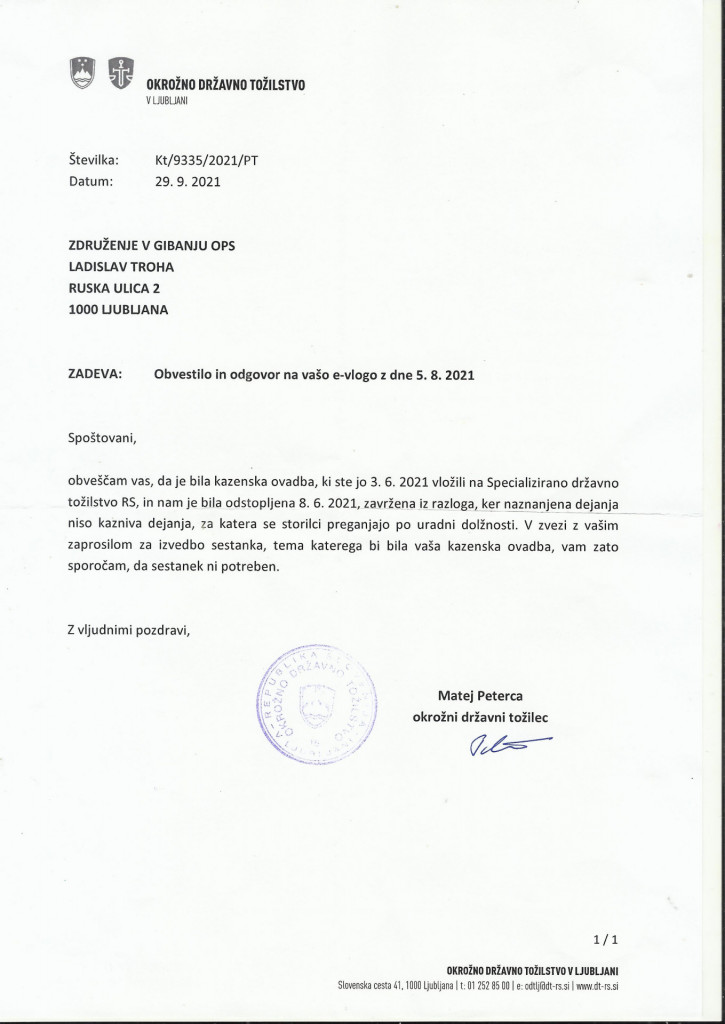 zavrgel kazensko prijavo na 70-ih straneh, ki smo jo sicer vložili na Specializirano državno tožilstvo 13. junija 2021, le-to pa jo je prerazporedilo na Okrožno državno tožilstvo v Ljubljani z izgovorom, da je oni niso pristojni obravnavati, kar je popolna laž.